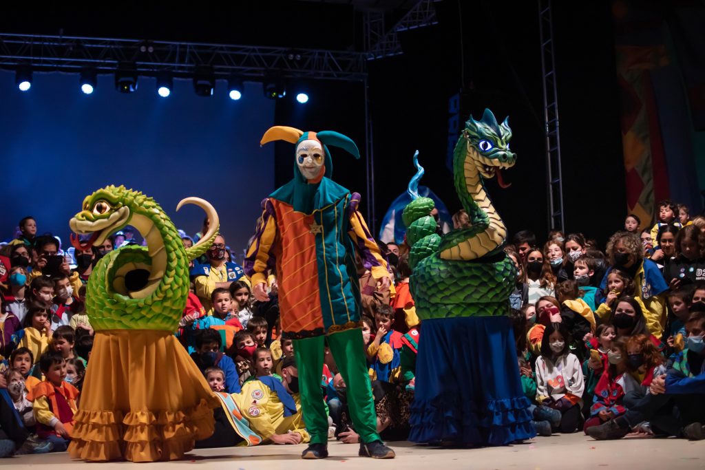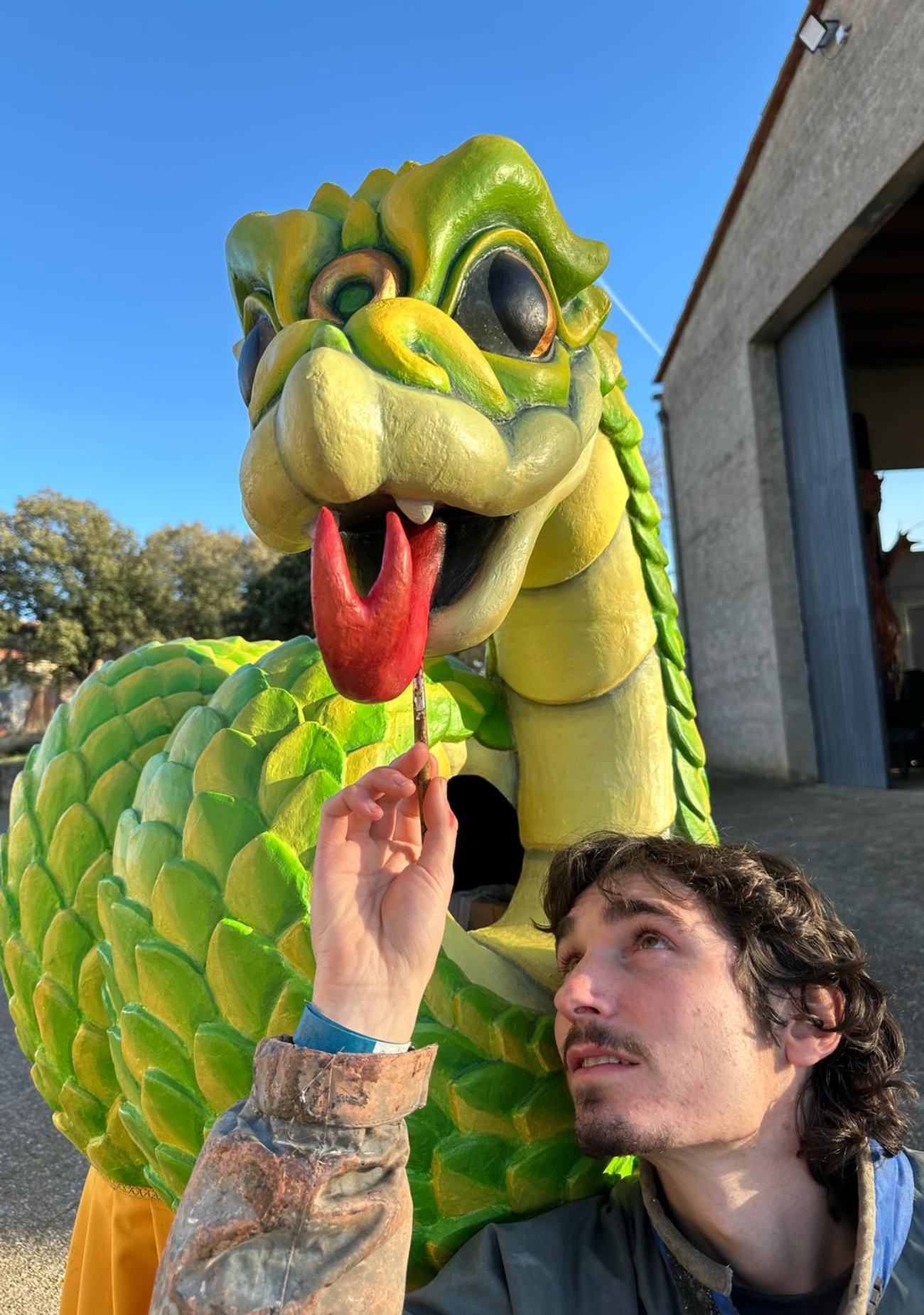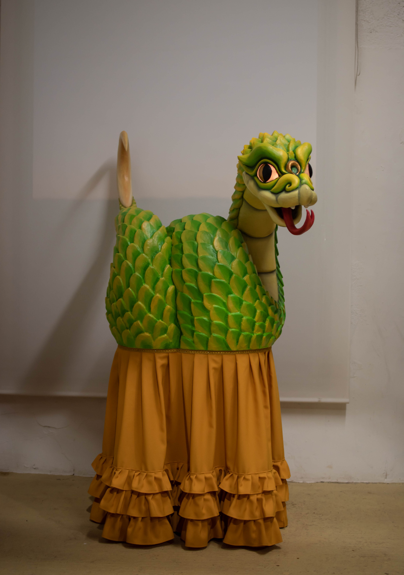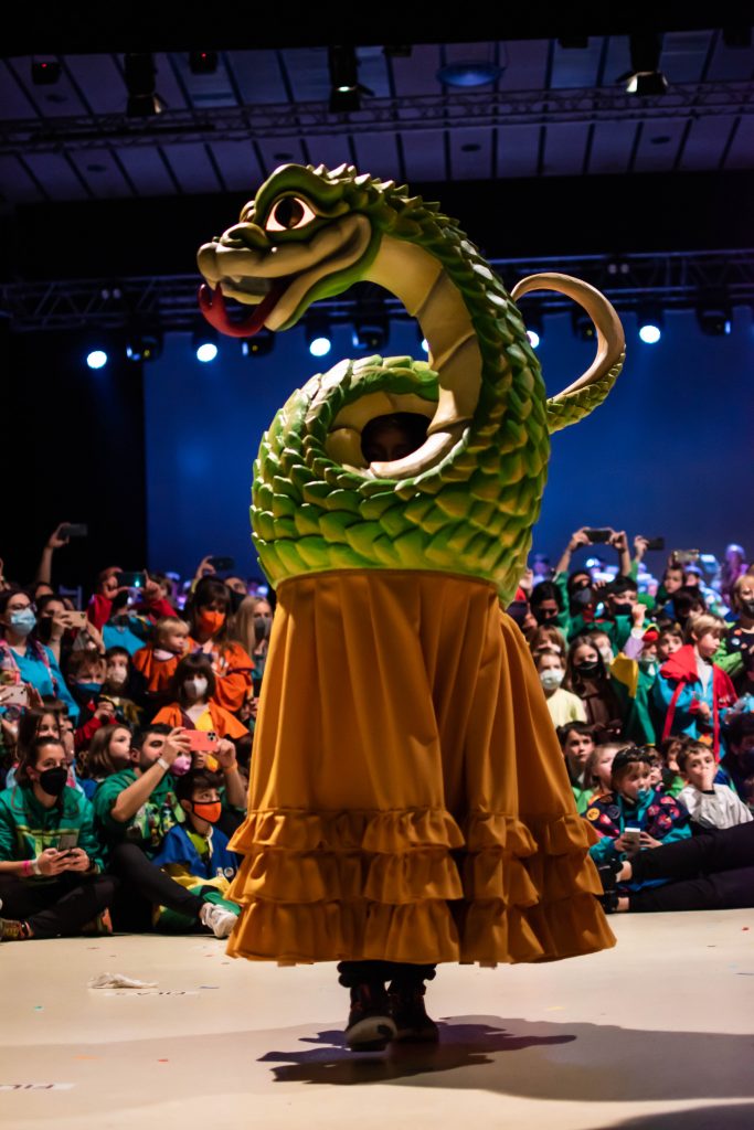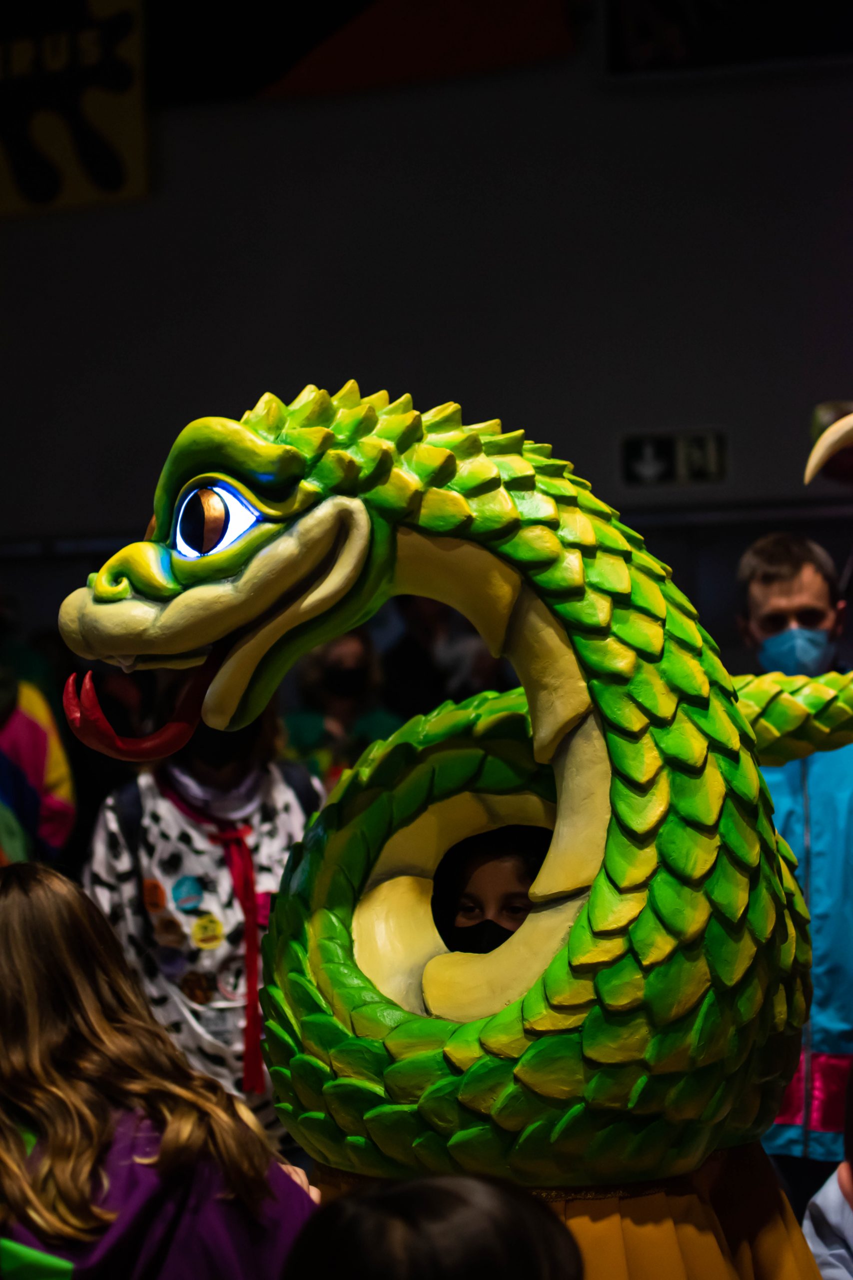 Approachable and cheerful, she is a mixture of dragon and snake. Its position, looking towards one profile and the tail protruding from the other endows it with a characteristic and at the same time singular dynamism in the world of festive bestiary. It is danced by the children audience, to which it adapts with its weight and dimension. The scales on the head are pointed upwards, the eyes are large and the tongue is bent towards the nose. The design is inspired by children drawings from Solsona and includes elements from the story Les Llunes de l’Espedrera such as the tail ending in a moon shaped ribbon.