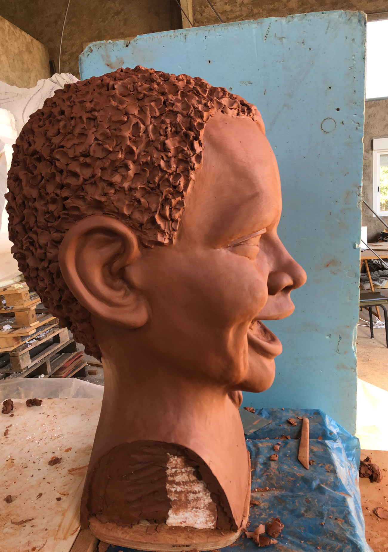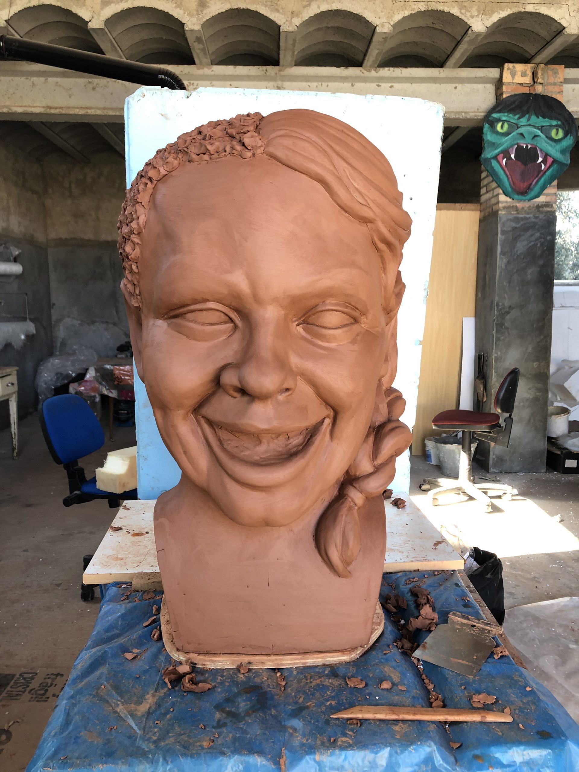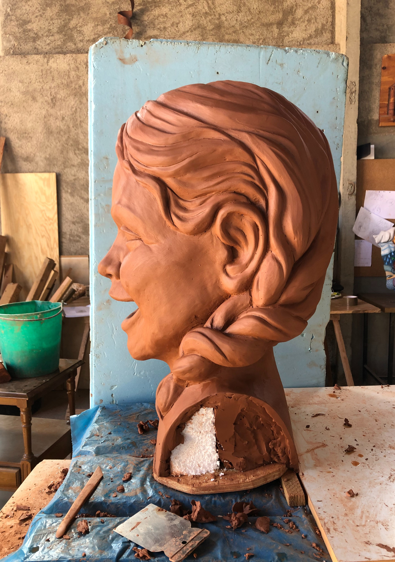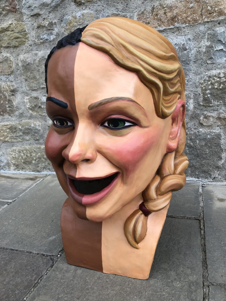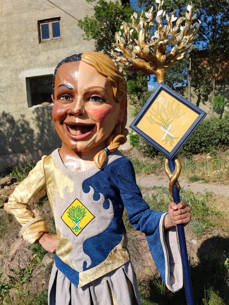 Two smiling faces on the same tadpole, that of a boy and a girl. It is inspired by the winning drawing chosen by the students of the Oliana school in which interculturality is represented. The clothing follows the same binomial with the colours blue and gold, the shield of the town of Oliana shines on the chest and the sceptre is crowned by a golden representation of the olive tree and an oil painting of the same tree and the white cross of Sant Andreu.