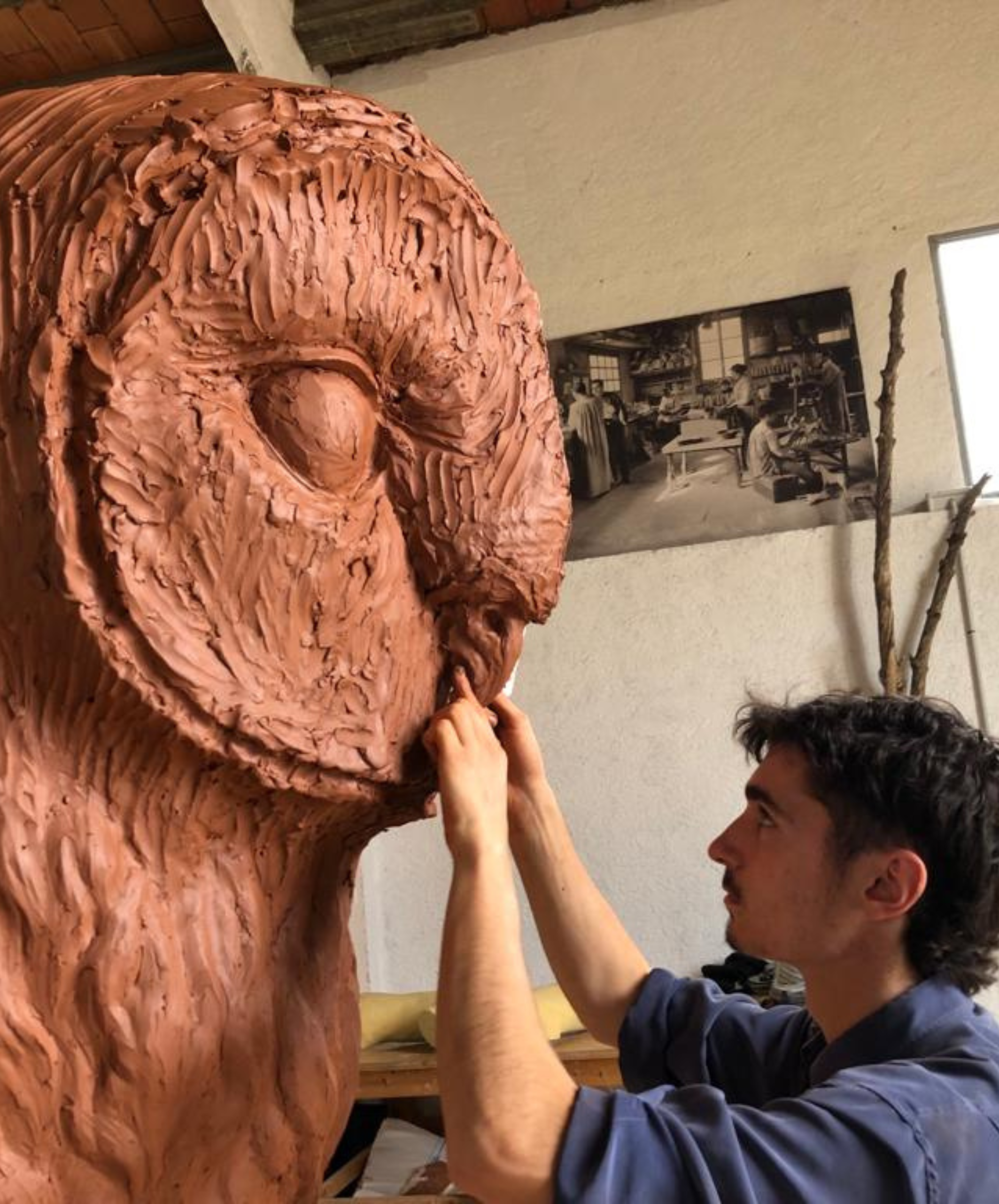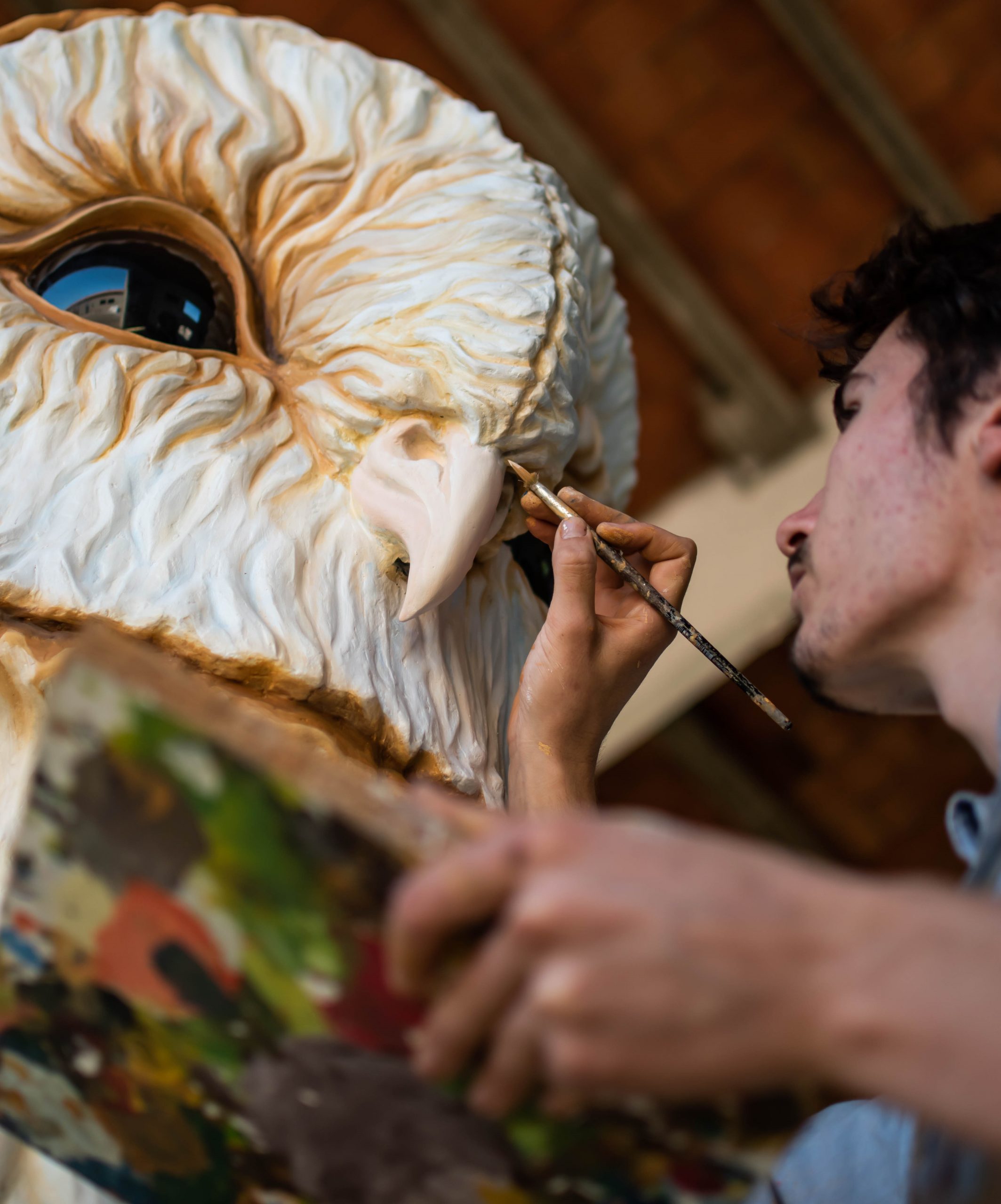 The bird of wisdom, proximity and mysticism. The eyes and the whole of his face express these three characteristics. Starting from a study of the plumage of this bird, each and every one of its feathers is elaborated in detail. The lightness of the material and the work of the padding allow the wearers a fluid and punctuated movement that enhances the whole of the figure and clothing. Based on a colour gradient, the owl combines earthy whites with a dark and pure blue, a symbol of the depth and purity of this bird.