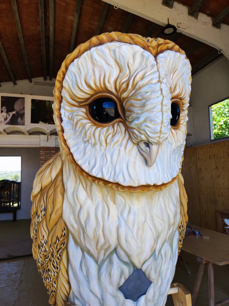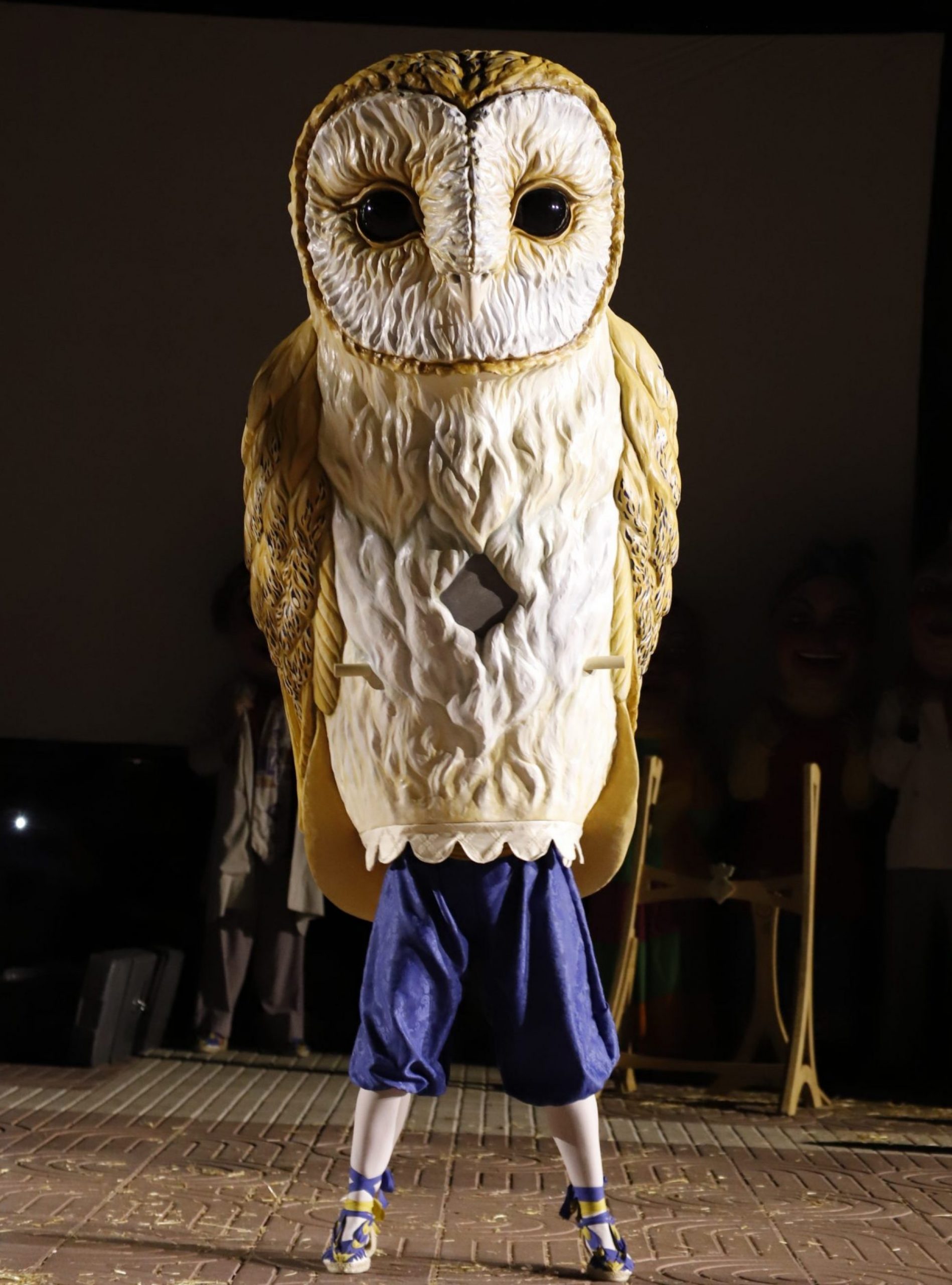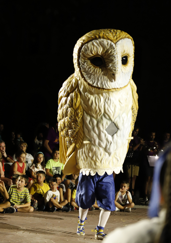 L’au de la saviesa, la proximitat i el misticisme. Els ulls i el conjunt del seu rostre expressen aquestes tres premisses. Partint d’un estudi del plomatge d’aquest ocell s’elaboren al detall totes i cada una de les seves plomes. La lleugeresa del material i el treball de l’encoixinat permeten als portadors un moviment fluid i puntejat que realcen el conjunt de la figura i vestuari. A partir d’un degradat de color l’òliba combina blancs i terrosos amb un blau fosc i pur, símbol de la profunditat i puresa d’aquesta au.