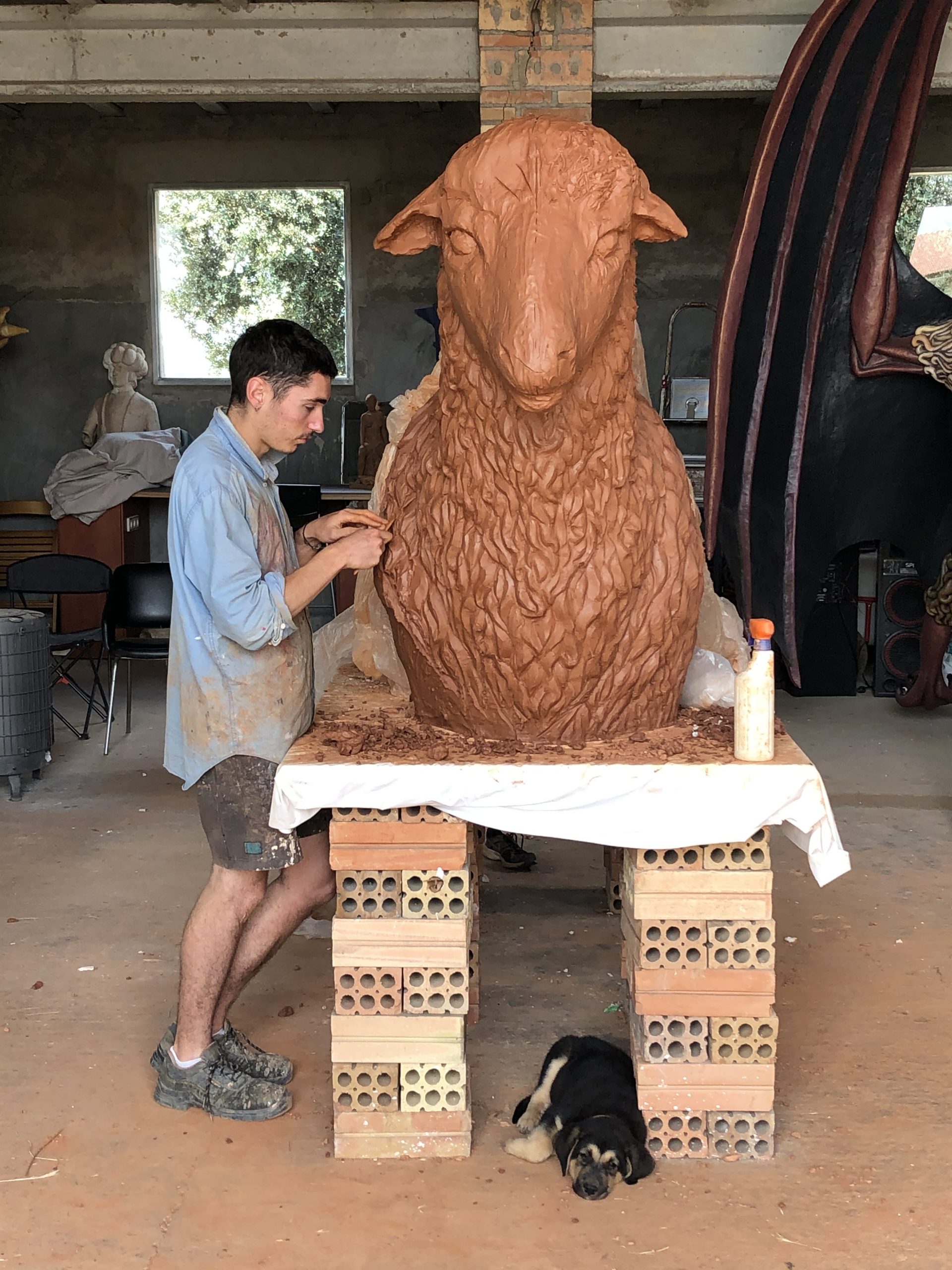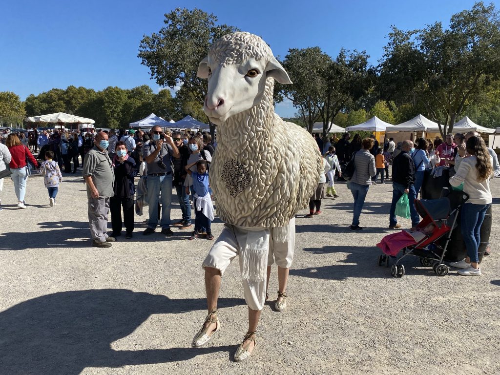 A docile, pure, white figure. The look of the sheep and its calm and tender expression make this sculpture a close and joyful image. The fact that it has the legs of the wearers in sight allows for elaborate choreography and movements. However, the sculpture of the fur/wool is reinforced with curls elaborated in detail with a painting based on chiaroscuro and shades of white.