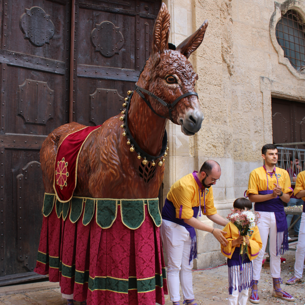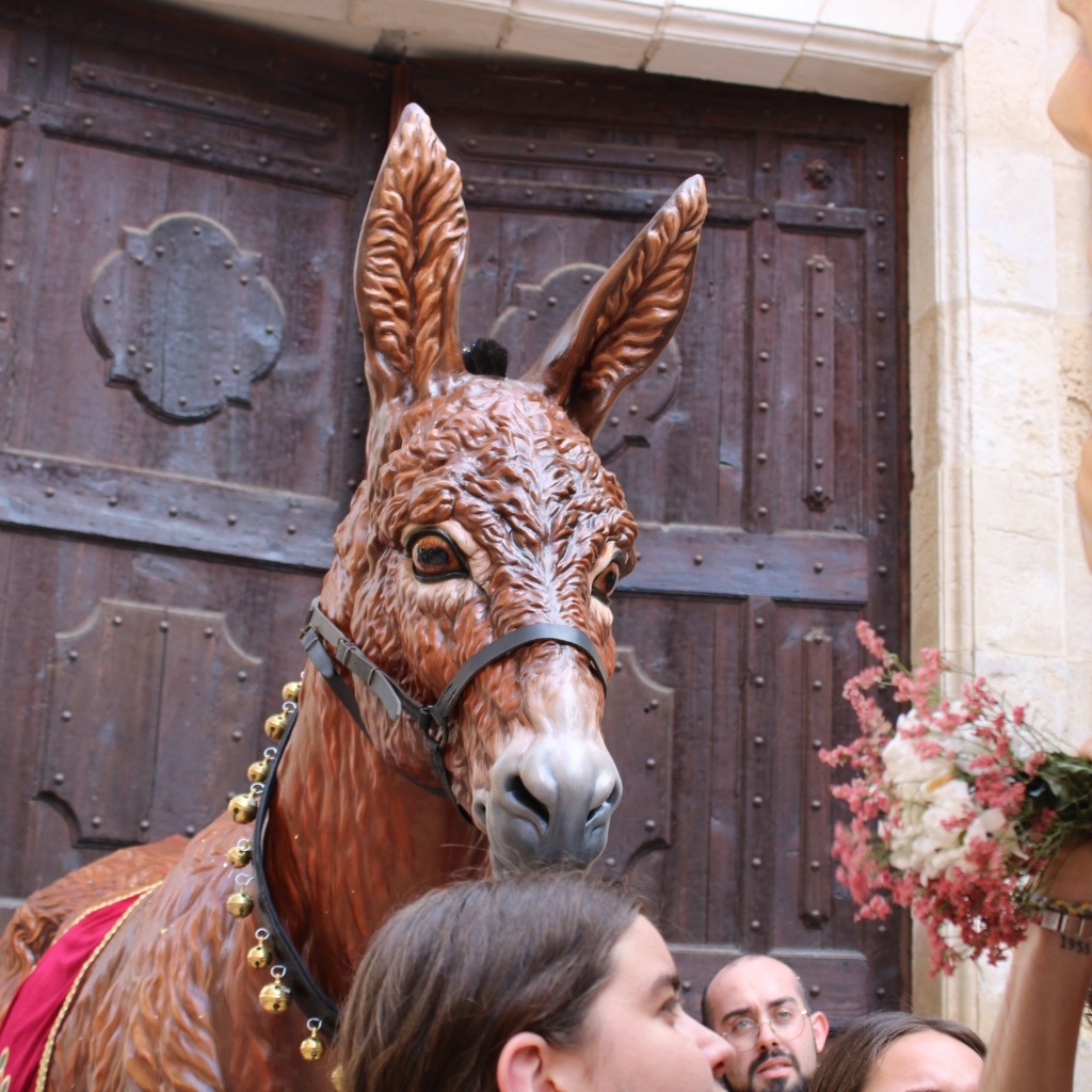 With a friendly and approachable expression, the Somera of Reus starts from an anatomical study of the musculature and shapes of a donkey, and the sculpture and painting are outlined with a delicate work of this animal’s fur. The eyes are made of methacrylate and the neck is decorated with bells that ring to the rhythm of their dance. The medieval iconography of the rose of Reus appears on the dome.